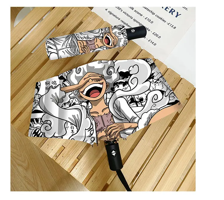 An automatic One Piece Nika Luffy Fold Umbrella with a three-fold design, featuring Gear 5 anime art and black glue sunscreen.