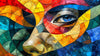Stained Glass Art Portrait of a colorful abstract face with a piercing blue eye in a modern cubist style, for instant download.