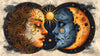 Sun and Moon Art depicting the duality of two faces, one representing the sun and one the moon, in a vintage illustration style.