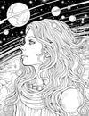 The Stargazer Queen Coloring Page, a detailed black-and-white illustration of a beautiful queen in profile with long, wavy hair, looking peacefully at a sky filled with planets and stars.