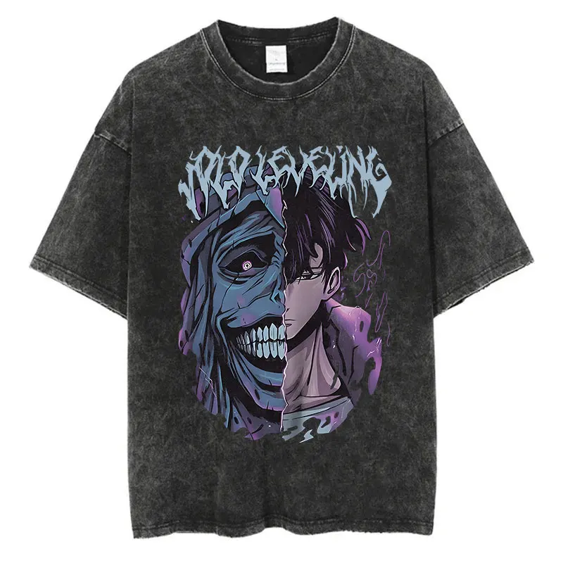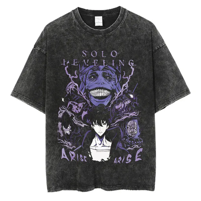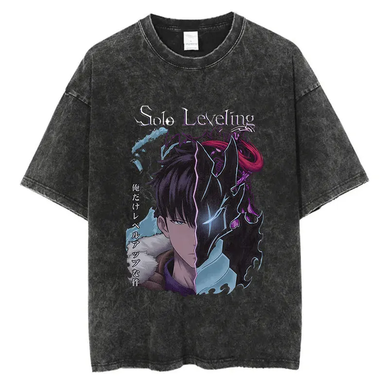 Experience the superior comfort of premium, acid-washed cotton. We engineered this Solo Leveling Vintage T-shirt to feel incredibly soft against your skin, providing breathable comfort during hot summer days or intense gaming sessions. The distressed fabric texture adds depth to the high-definition anime print, ensuring the artwork blends naturally with the material rather than sitting on top like a cheap sticker. You enjoy a relaxed, Harajuku-inspired fit that drapes effortlessly, making it the ideal choice for creating oversized, urban outfits.