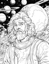 The Cosmic Creator Coloring Page, a detailed black-and-white illustration of a majestic, bearded god-like man with long wavy hair, looking up thoughtfully at a sky full of stars and planets.