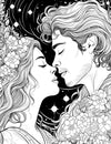 The Cosmic Lovers Coloring Page, a romantic black-and-white illustration of a man and a woman about to kiss, surrounded by blooming flowers against a celestial background of stars and planets.