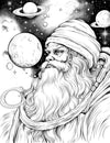 The Cosmic Sage Coloring Page, a detailed black-and-white illustration of a wise old man with a long beard and a turban, gazing thoughtfully into a cosmic sky filled with stars and planets.