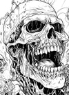 A detailed, heavy-metal style horror coloring page of a screaming, exploding skull with sharp spikes, surrounded by a chaotic blast of sinewy, organic gore and energy.