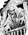 A detailed horror coloring page of a skeletal, hooded ghoul with glowing eyes and long, sharp claws, climbing menacingly out of a broken attic window in a haunted house.