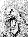 A detailed horror coloring page of a Raging Werewolf's face, roaring with intense, wild eyes, a mane of flowing hair, and a mouth full of sharp, beastly teeth.