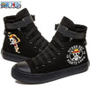 Trendy One Piece Luffy High Top Shoes featuring anime character art, designed as breathable non-slip leisure sports sneakers for students.