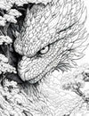 Our "SkyClad Dragon Overlord" coloring page presents a truly monumental and incredibly detailed portrait of a magnificent dragon. Its colossal head, covered in layers of intricate, individually rendered scales and crowned with a crest of feather-like protrusions, dominates the scene. A single, piercing reptilian eye, full of ancient wisdom and power, stares directly at the viewer. The dragon emerges from a dramatic mountainous landscape dotted with stylized, ancient trees, with clouds or mist swirling below, creating a sense of immense scale and epic atmosphere. The design is a tour-de-force of texture and intricate line work, offering a truly challenging and rewarding coloring experience.
